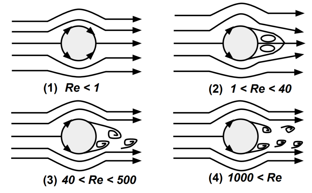 (3) レイノルズ数が 50~500 程度の場合は、流れの上下の対称性が崩れて円柱背後