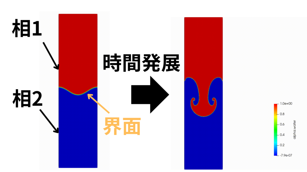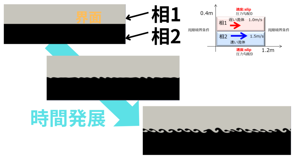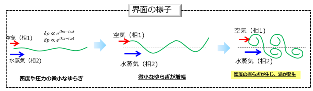 2相の界面でせん断力があるため不安定性の種(渦)が生じ、それが時間とともに増幅することで生じる2次元的な模様のことを指します。