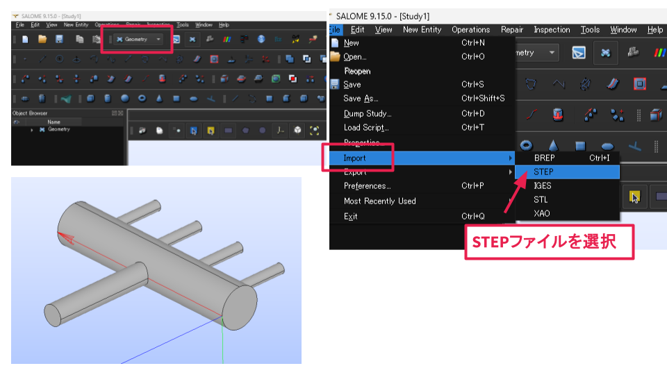 読み込み後、Object Browser(左側)に Solid などの形状が表示されます。
