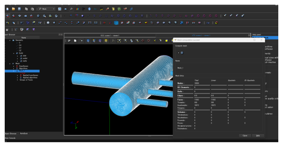 成功すると、メッシュが表示され、要素数などの結果ウィンドウが出ます(画像のメッシュ統計の画面)。
