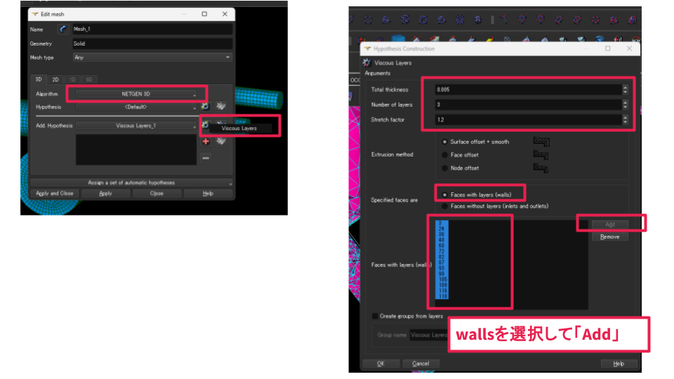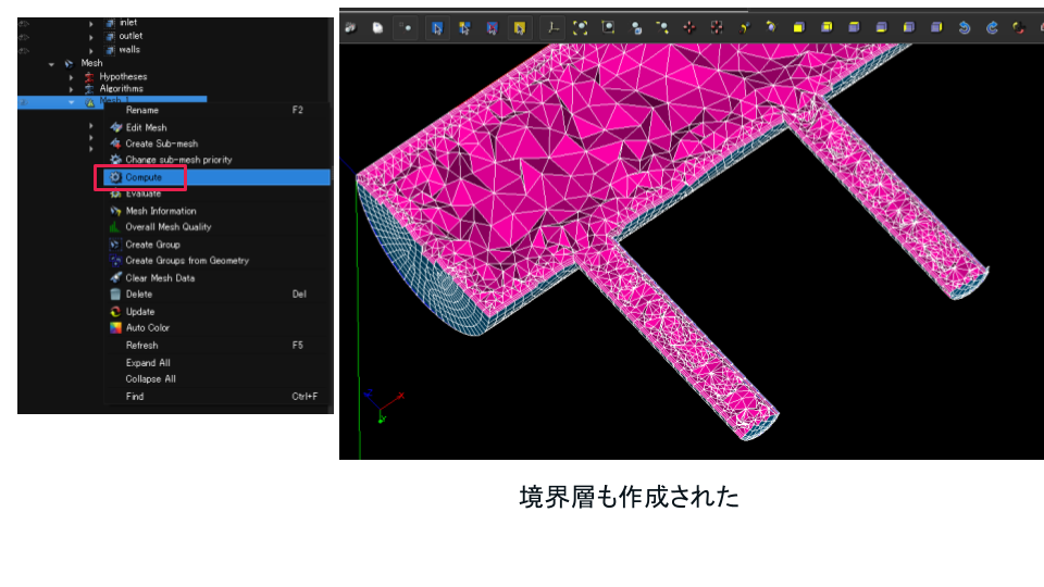 境界付近に層状の要素ができているのが確認できます(画像の「境界層も作成された」)。